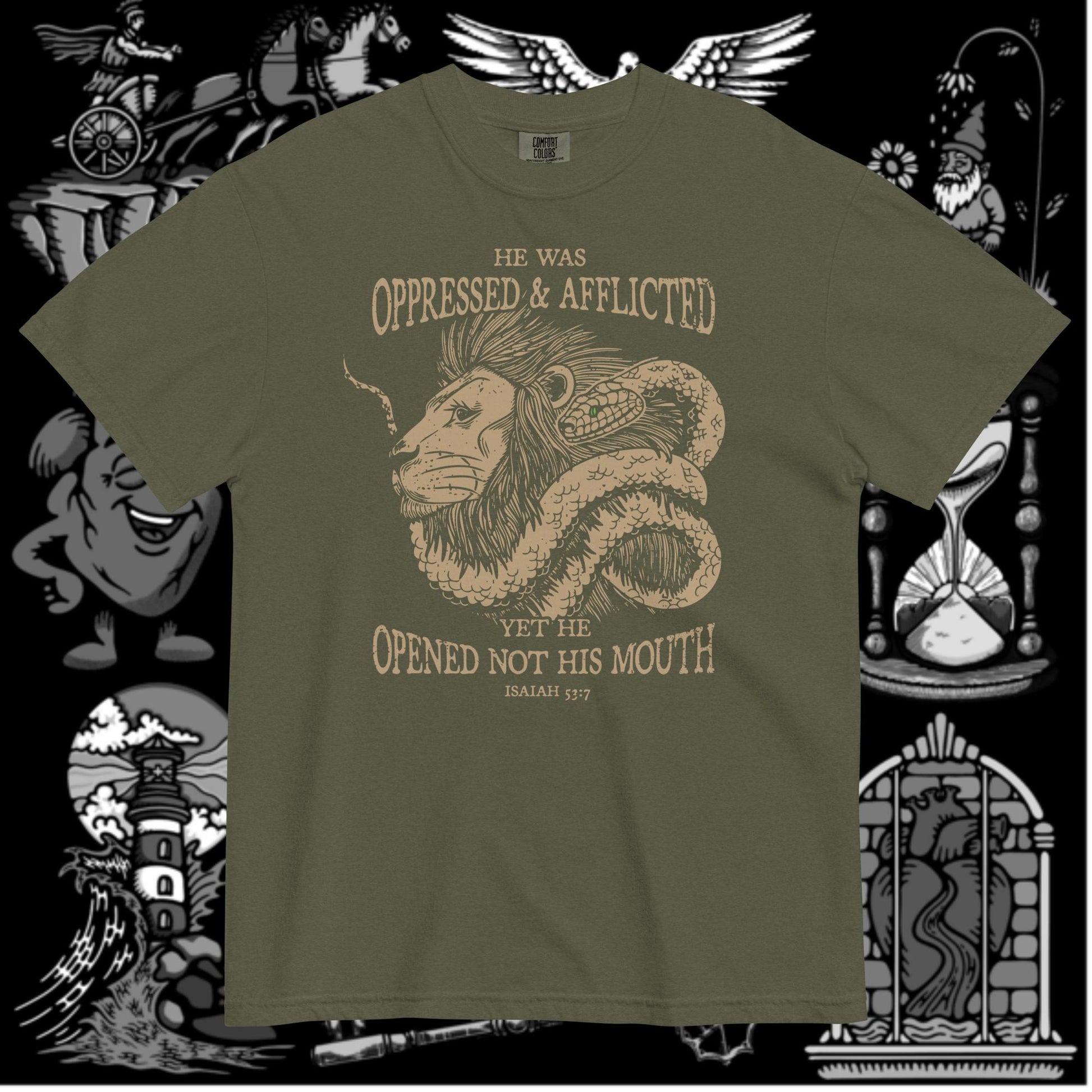 This Comfort Colors® tee features a hand-drawn design of a lion and a serpent—a powerful visual of Christ’s quiet strength in the face of injustice. Inspired by Isaiah 53:7, this piece reminds us that true power doesn't always roar. Sometimes, it chooses silence.