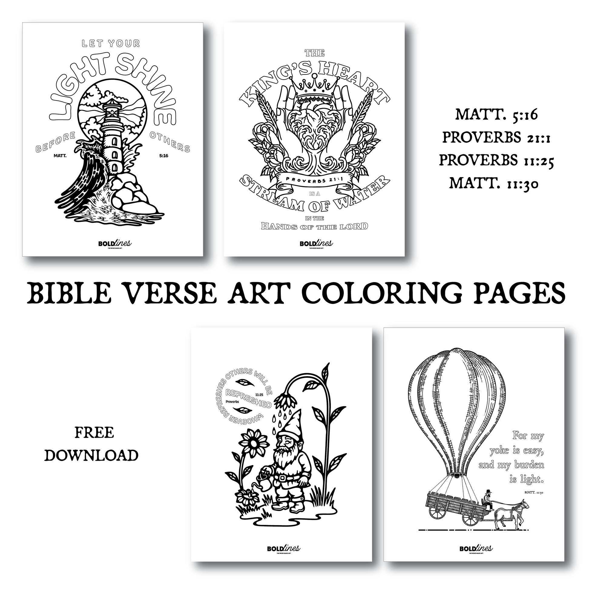 Bring scripture to life with this free set of 4 printable Bible verse coloring pages. Each design is hand-drawn and styled as bold Christian artwork—perfect for personal devotion, family time, or small group study.