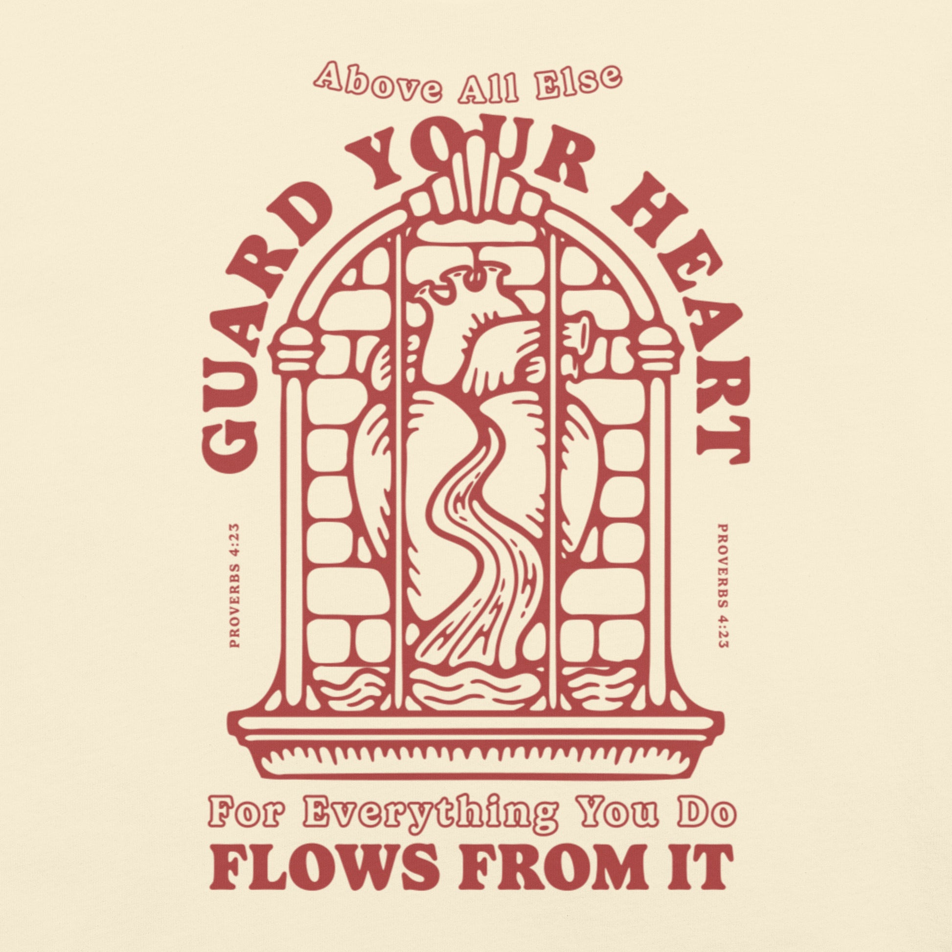 This eye-catching Christian T-shirt features Proverbs 4:23 in a hand-drawn, bold design by Bold Lines Co. The anatomical heart is framed in a medieval-style arch with flowing water, reminding us that what’s within shapes everything that flows out.