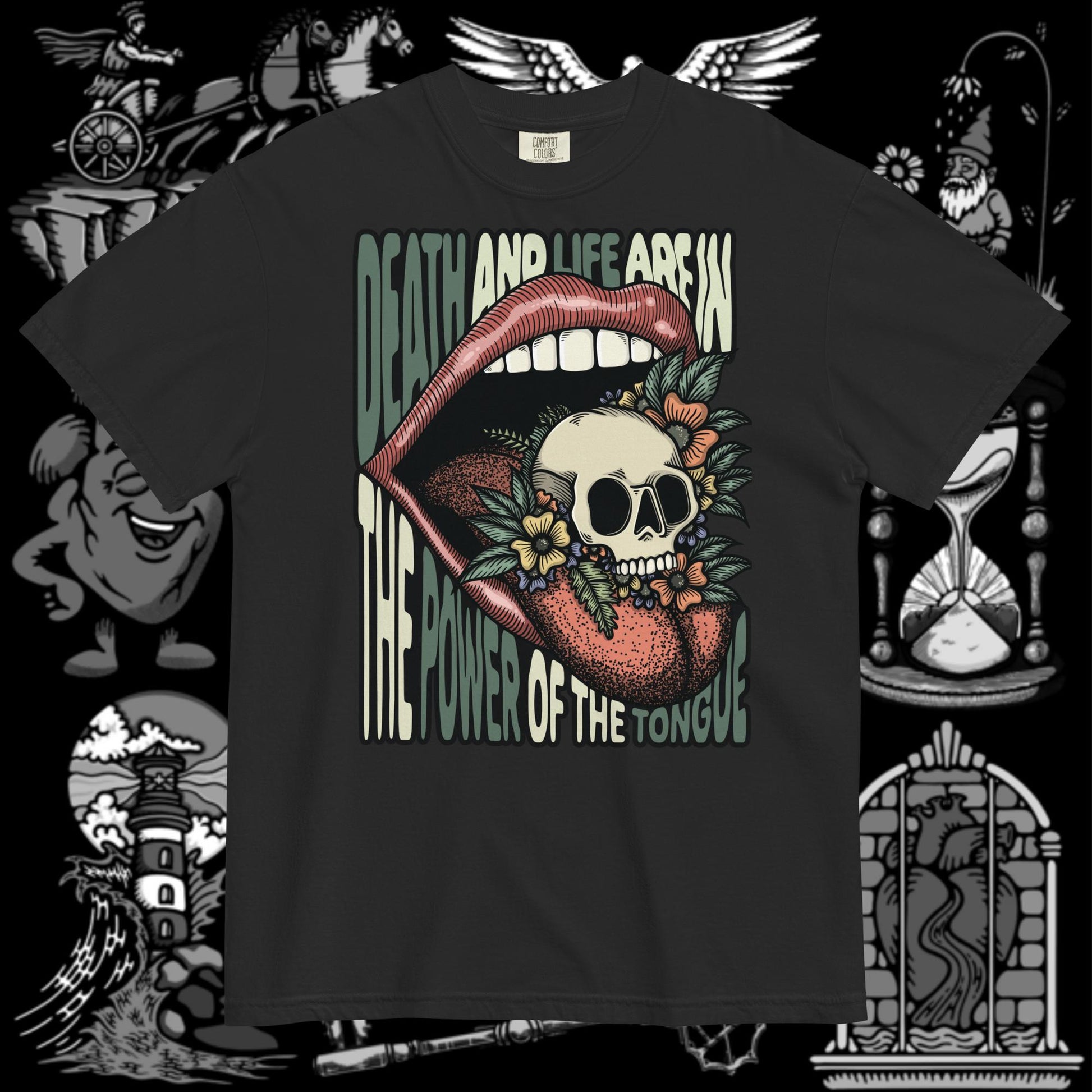 Make a bold statement with this striking Christian graphic t-shirt, featuring a powerful design inspired by Proverbs 18:21—"Death and life are in the power of the tongue." The intricate artwork blends a detailed skull, floral elements, and a vivid open mouth, symbolizing the profound impact of words. Made from 100% cotton, this unisex tee offers unmatched comfort, durability, and eco-conscious craftsmanship. Whether you're looking to inspire, spark conversation, or elevate your faith-based fashion, this top-quality tee is a must-have in your wardrobe.